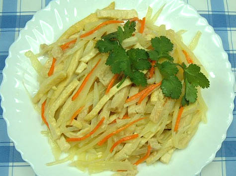 2、烧热2汤匙油,放入甘笋丝炒片刻,再放入豆干丝、素肉丝炒,然后加入薯仔丝及调味料快速炒匀上碟。