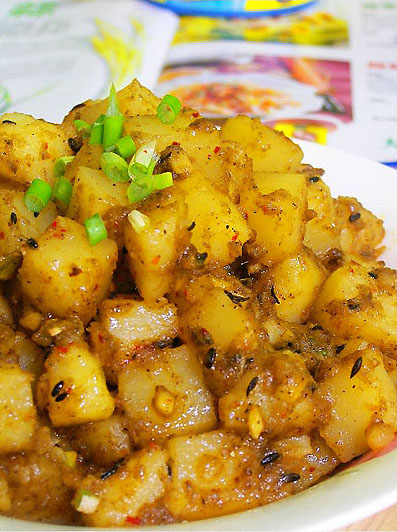 4.炒锅中倒入油,中火加热至七成热,放入孜然粒煎炒10秒钟,之后放入切好的土豆块,加入姜末、孜然粉、辣椒粉、黑胡椒粉、剩余的盐1茶匙,翻炒10分钟,使土豆块入味。