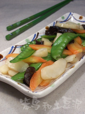 4. 热锅凉油,先炒胡萝卜片,再下黑木耳和荷兰豆,最后放入马蹄片,调入适量盐,略炒即可。