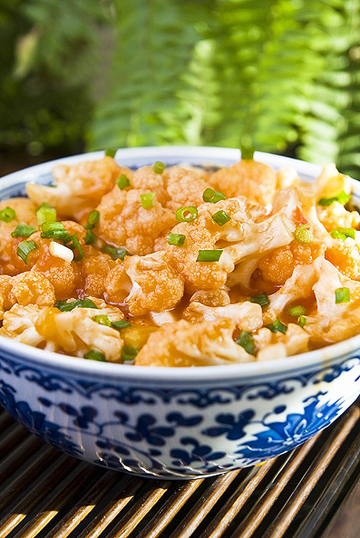 3、锅里放油,加入番茄酱,炒到油酱混合后,加入西红柿丁,翻炒均匀后,加入菜花。加少许水,少许糖、小炖3-5分钟,加入淀粉水勾芡,加盐出锅。