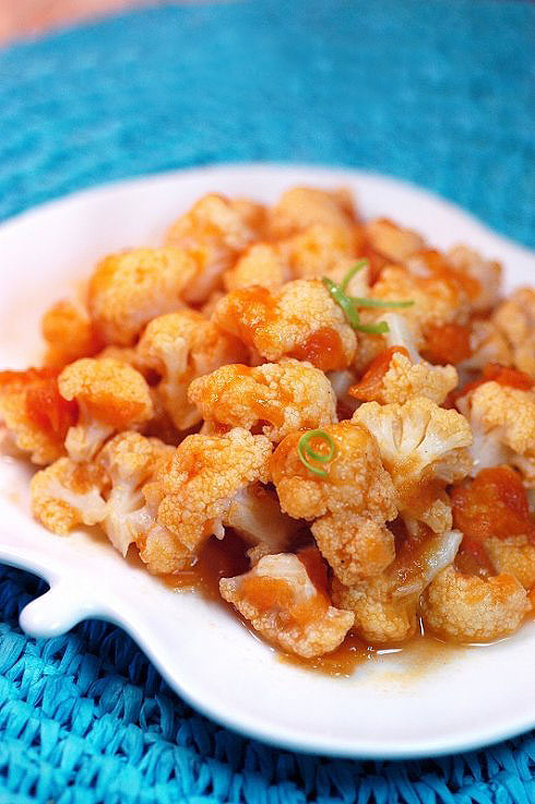 1.花菜在淡盐水里浸泡后,用手掰成小朵,冲洗干净.番茄去皮切成小丁.烧热油锅,入番茄丁煸炒软后,加一小勺白糖翻炒透至出沙.