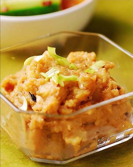 2、取出冲凉,去皮,用铲子将土豆捣成泥状。