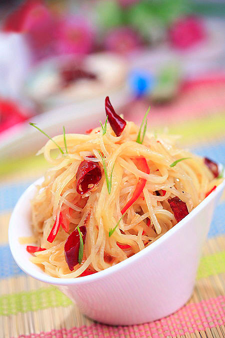 8,倒入青椒丝,再倒入白醋,和盐关火即可。