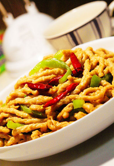1.锅中放入色拉油小火烧热,放入干红辣椒炒香后,放入洗干净的面筋丝,大火翻炒,加入盐和生抽调味。