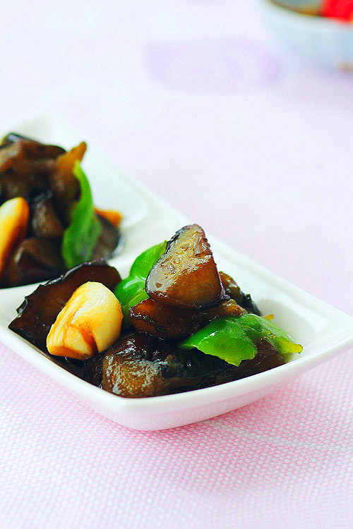 2,茄子洗净后切成滚刀状,青椒用手撕成小块