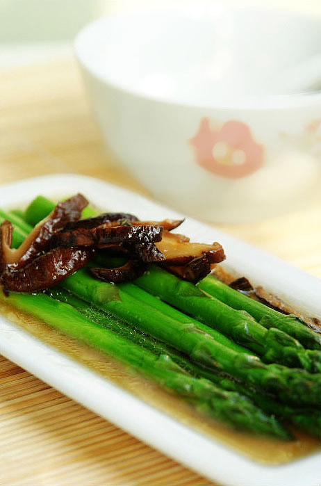 2.锅中放入1小勺色拉油,烧热放入香菇丝和少许姜丝炒香(小熊用的姜粉),然后加入高汤烧开,调入少许水淀粉烧至浓稠。冷却的芦笋装盘将浓稠的汤汁淋上即可。