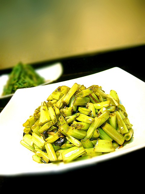 d、最后倒入菜梗,生抽,盐、蘑菇精,将菜梗炒熟后即可起锅。