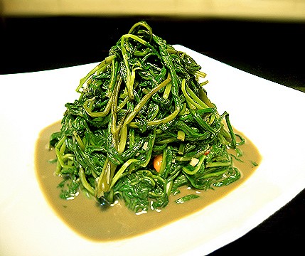 e、之后倒入菜叶,炒到半熟放入准备好的豆腐乳酱、生抽、蘑菇精、炒熟即可。
