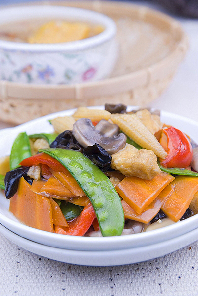 【原料】荷兰豆、红柿子椒、豆腐泡、胡萝卜、口蘑、玉米笋、黑木耳