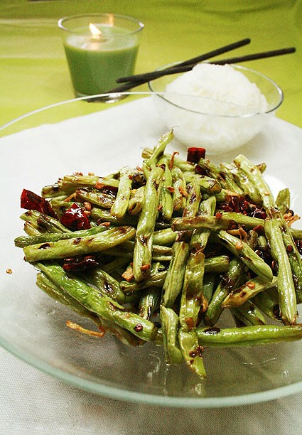 2、炒锅内不放油,直接倒入豆角翻炒至有虎皮状后关火放入盘内