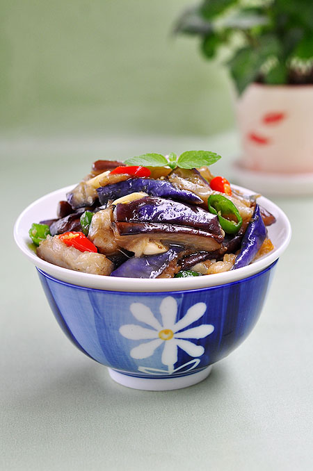 1.茄子切长条浸泡在冷水中20分钟。这样即省油,又不会让茄子变色。