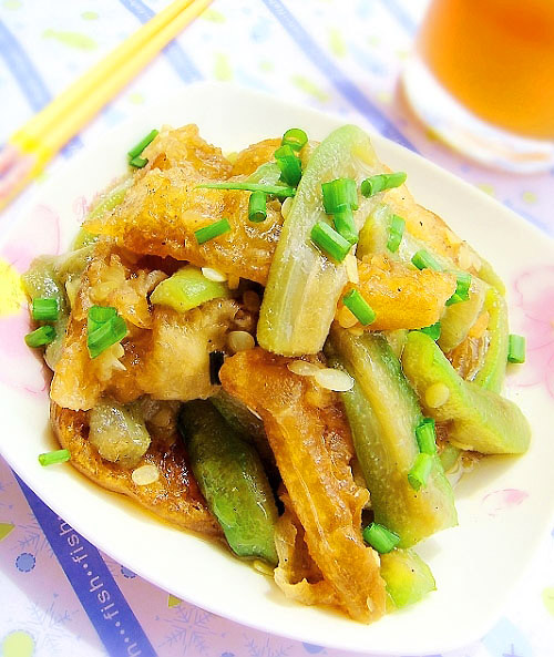 3. 热油,爆香姜,倒入丝瓜油条同炒,加盐,胡椒,半勺酱油,快速翻炒几下即可。