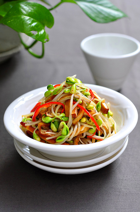 1.黄豆芽去根,洗净沥干水份。香干切成长条,红椒去籽切成细条。