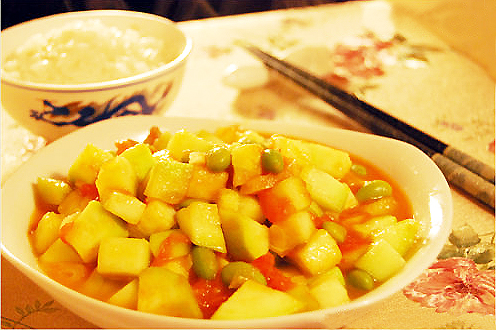 做法:翻炒西红柿,加入青豆、西葫芦丁翻炒,加盐即可出锅。
