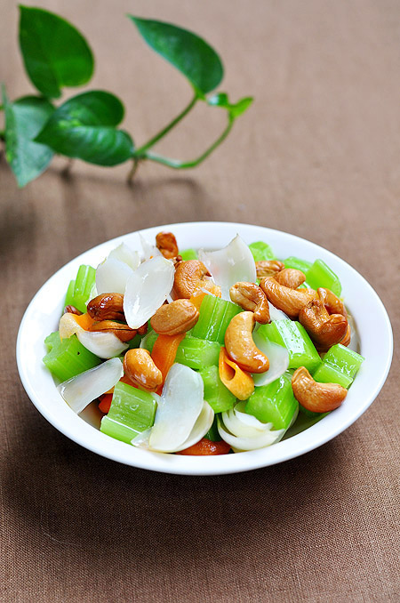 材料:百合50克 西芹100克 胡萝卜50克 腰果50克