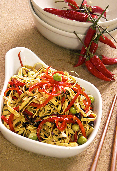 3、再加入豆腐皮丝炒一下,同时调入盐和花椒粉。(因为橄榄菜是咸的,盐量不要加多了哦)