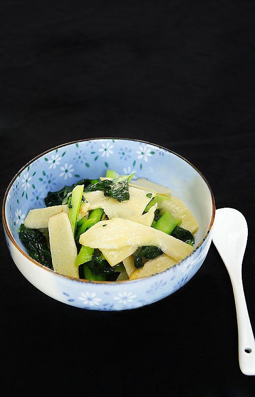 4.锅内加入少许精制油,放入塌棵菜煸炒,软身后放入滑过油的冬笋,煸炒,略微炒一会儿。加盐、蘑菇(代替味精)收卤汁不勾芡,出锅装盘即可。