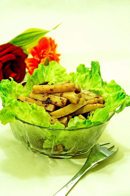 (3)净锅内放入橄榄菜煸香,放入沥干油的冬笋条,加清水半杯炒匀,调入少许盐(橄榄菜有咸味,注意盐的用量)略微煮一会儿,让冬笋入味,蘑菇精,(代替味精)炒匀,勾一点点薄芡,拌匀起锅,盛入盘内稍摆盘即可。