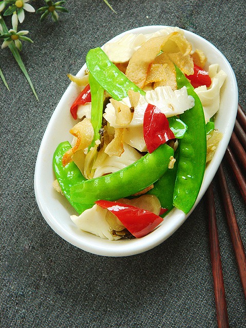 材料:荷兰豆200克,渔豆腐(魔芋制品)一包,酸菜一棵(约100克),香腐干条约50克(香腐干:潮汕地区干的豆腐切条,炸熟后味微咸中带香味),红辣椒1-2个