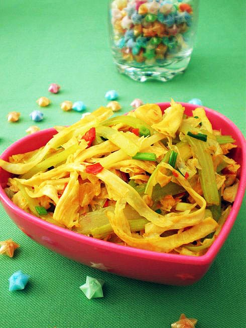1.腐竹提前泡发后捞出沥干先切成约5厘米长的段,再切成丝待用;芹菜洗净撕去老筋,也切成长5厘米左右的丝;生姜切丝,大蒜去皮切粒,葱切花;