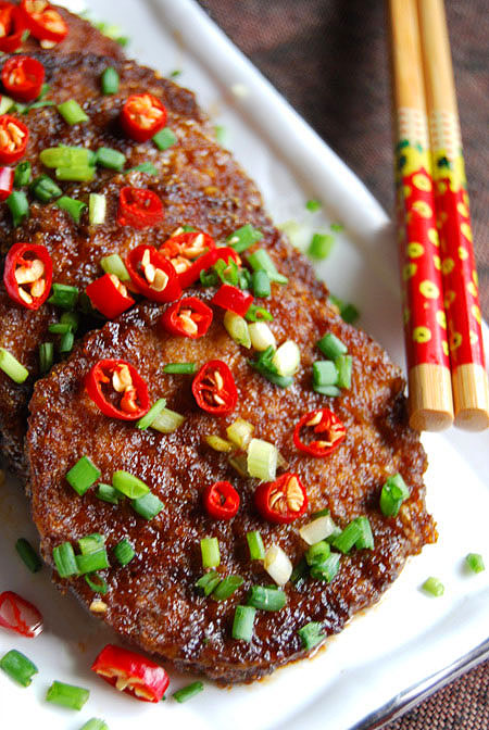 3、锅里放油,稍稍多一点,放入中火将素鸡用大火煎至两面金黄色,表面要起泡泡为止。