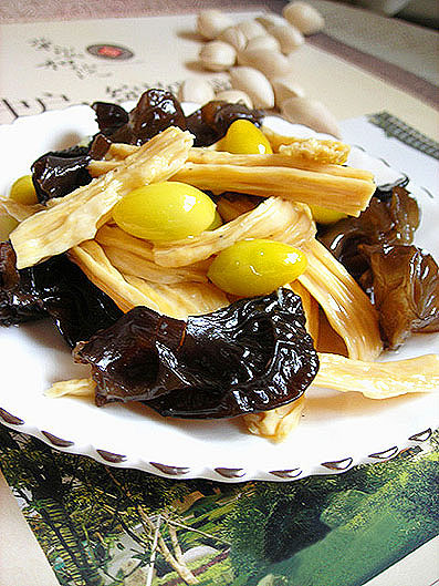 1、黑木耳、腐竹放入水中泡软,白果去壳和皮,放在热水中泡一会儿。