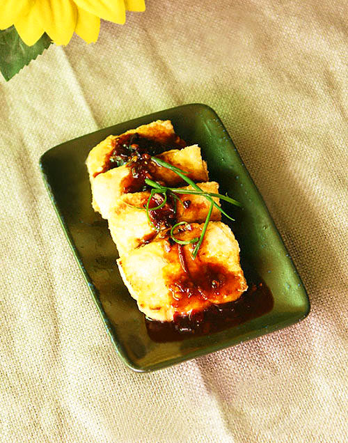 1、北豆腐切成3厘米×5厘米块状,用厨房专用纸抹去水分。干净无水盘中倒入生粉,将豆腐一块块双面拍上粉,静置三分钟,待粉吸收;调好味汁待用。