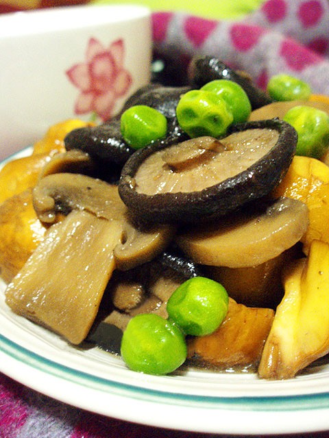 材料:干香菇、蘑菇、青豆、板栗 素蚝油、芝麻油。