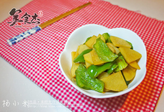 第3步锅内倒入少许油,倒入青椒炒至表面微微发干,倒入土豆片炒约20秒,倒入生抽、盐翻炒均匀即可