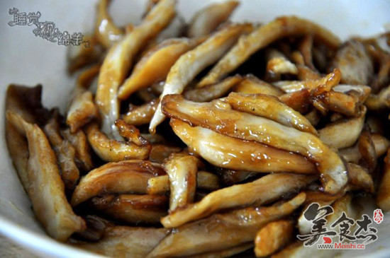 第1步将生抽、糖、素蚝油调成料,杏鲍菇洗净,用手撕成粗条