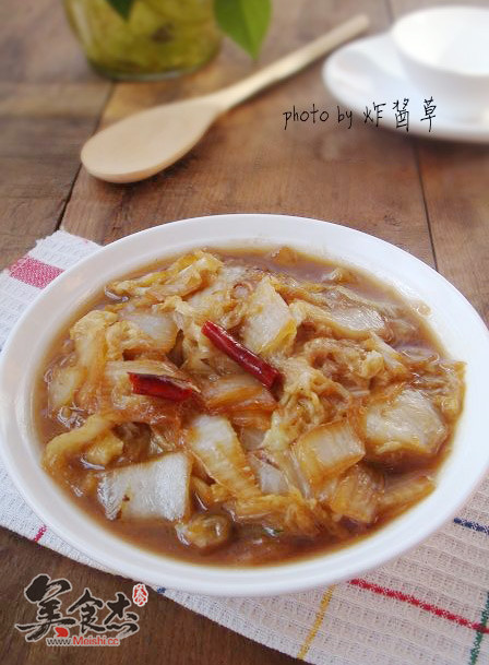 第3步先放入大白菜的梗部翻炒,翻炒的软些后加入白菜叶翻炒