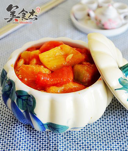 第4步将茄子炒软后,加入西红柿翻匀,小火炖煮至西红柿出汁