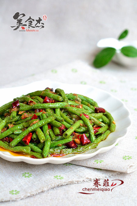 第4步放入豆角,加盐翻炒至入味;调入少许鸡精,翻炒均匀即可