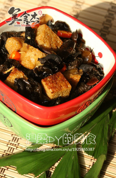 第3步将面筋块小火煎炸至四面金黄;放入黑木耳、香菇翻炒