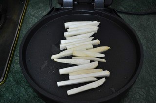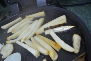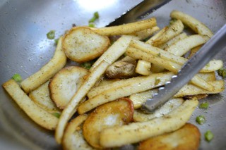 2 锅中热油,加入菇条煎制