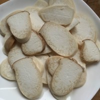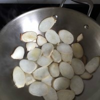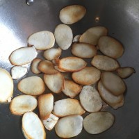 2. 锅里下橄榄油,烧热后,一片一片的夹入杏鲍菇,一面先煎