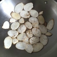 3. 开始杏鲍菇会出水,待水稍干后,撒上黑胡椒、白胡椒
