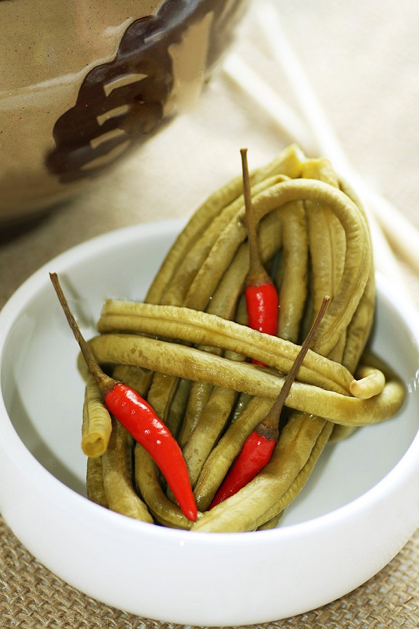 4、洗干净手后,将捆好的豇豆一把把轻轻放入坛子摆好,然后再放入朝天椒,铺好朝天椒后倒入另外一份盐,最后倒入烧开放凉的清水或纯净水至八、九分满