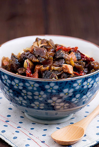 【原料】酱瓜3条、素肉馅一块、糖两勺、生抽一勺、蒜一头,姜3片切碎,葱几片、干辣椒。