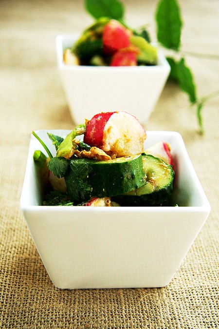 1、黄瓜、水萝卜拍段、尖椒用手掰成小片、香菜、香葱切成小段、蒜切片,一起放入盆中;