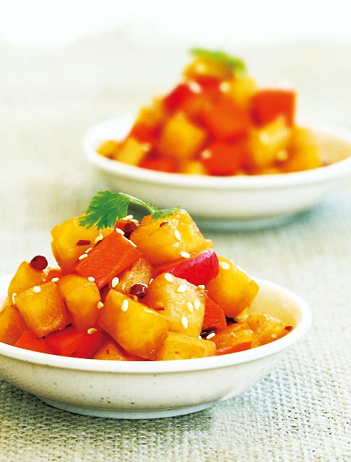 1、白萝卜、胡萝卜去皮切成指头大小丁,樱桃小萝卜切成指头大小丁;
