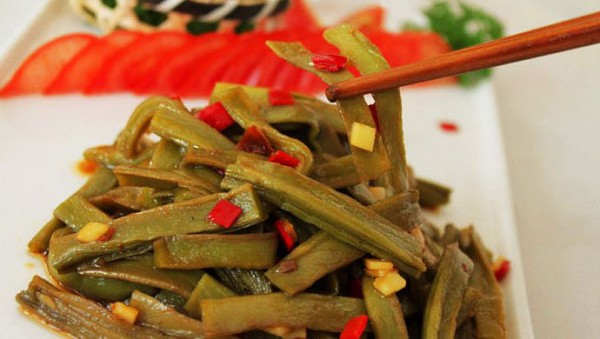 3、净锅放入少许油烧热出锅淋在贡菜上、再搅拌均匀倒出放入盘中即可。