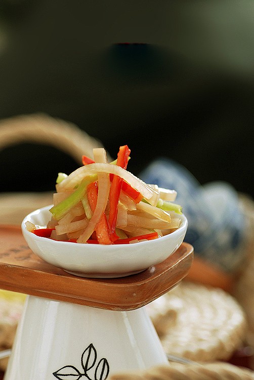 材料:咸菜疙瘩半个,青红椒各一个。生抽少许,醋,香油,花椒油。