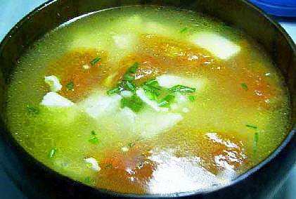 锅内入油,油热加入番茄煸炒,加盐,加水烧开,倒入豆腐块,转小火焖烧三五分钟,加味精调味,加水淀粉勾芡,撒一些白胡椒粉,淋麻油,再撒一些葱花盛出。