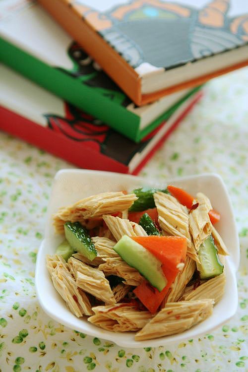 配料:腐竹,黄瓜,盐,蘑菇精,陈醋,辣椒油