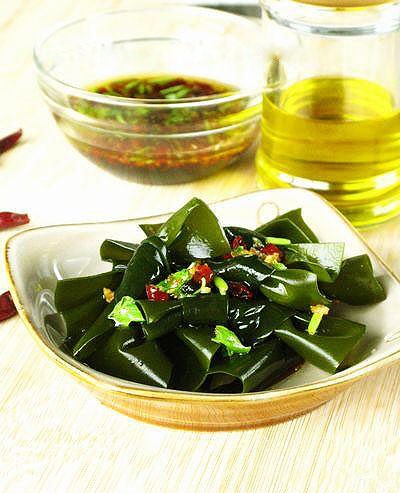 材料:海带结150克、干辣椒数个、香菜1-2棵、西班牙橄榄油15克、柠檬酱油汁25克、醋1小勺。
