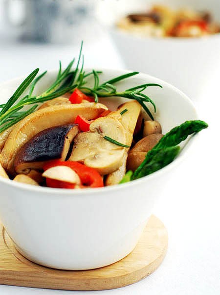 材料: 口蘑4-5朵、杏鲍菇半个、草菇4-5个、香菇4-5朵、新鲜迷迭香3-4支(没有新鲜的,可以用瓶装干香草)、芦笋2-3根、红椒半个