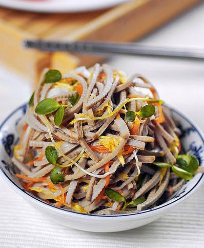 4)豆腐丝用开水稍烫一下捞出控干晾凉切成和菜丝一样长的段备用