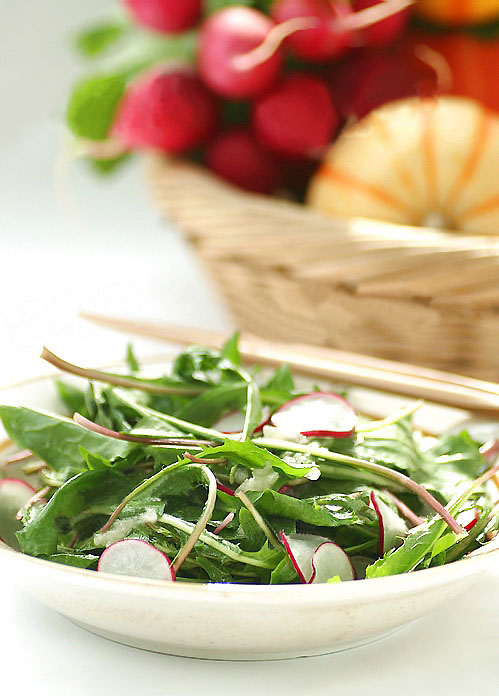 2)将苦菜叶,小红萝卜片倒入大碗中,调入盐、蘑菇精、白醋和香油搅拌均匀,静置2分钟后,待叶子稍变软后即可食用。