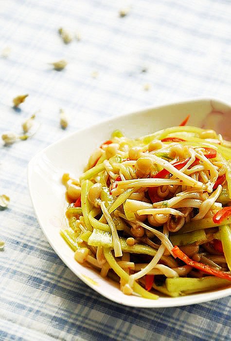 【原料】金针菇,黄瓜1根,红椒1个,橄榄油适量,另准备凉开水一大杯